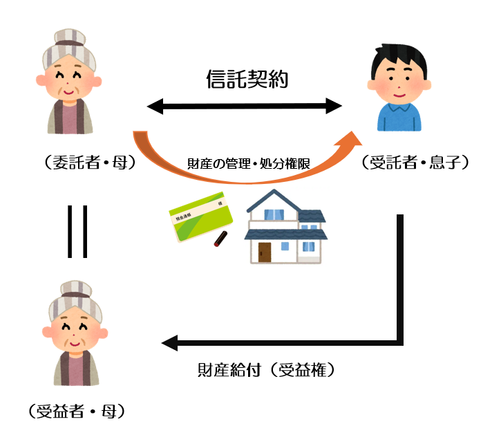 上記の図は、母と息子が信託契約を結び、息子が母のために預貯金と不動産を管理しているという状況を表しています。
