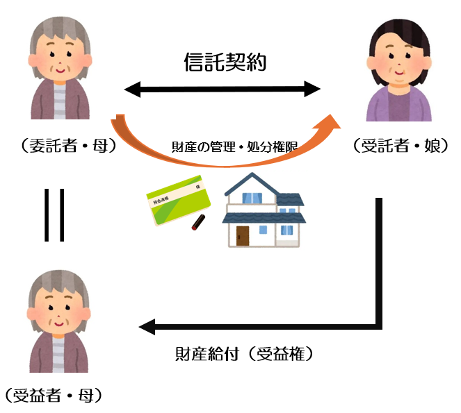 これにより、将来どこかのタイミングで母親が認知症になったとしても、娘は事前に用意しておいた信託財産管理用の口座からお金を引き出し、母親の生活のために使うことができるようになります。不動産についても、契約の中で定めた「信託の目的」に則り、娘の一存で売却等の処分が可能になります。