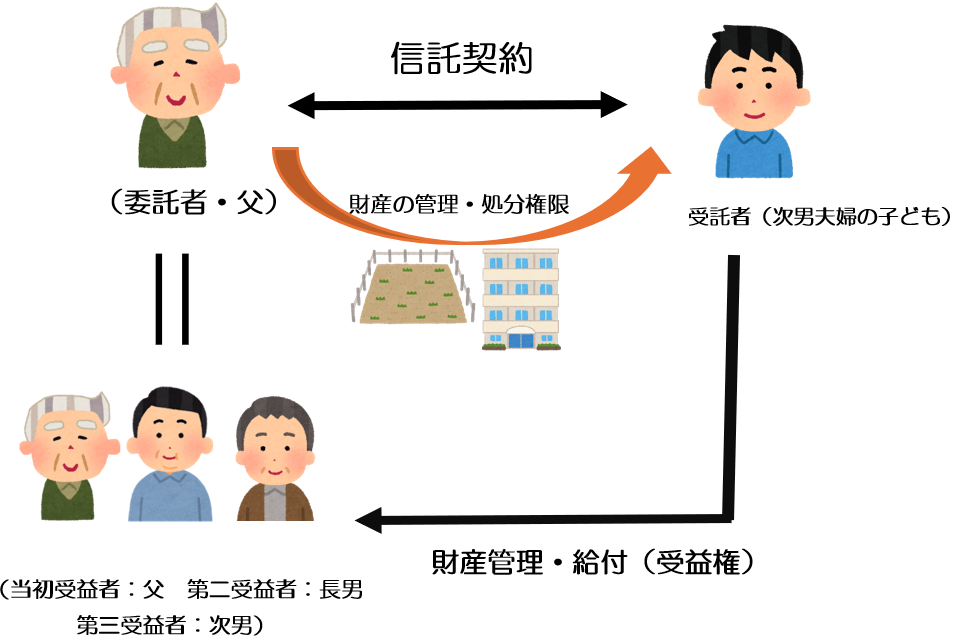 信託した財産は受益権という形で、父→長男→次男と世代を超えて承継されていき、最終的には相談者の希望通りに、受託者である孫(次男夫婦の子ども)に継いでもらうことができます。