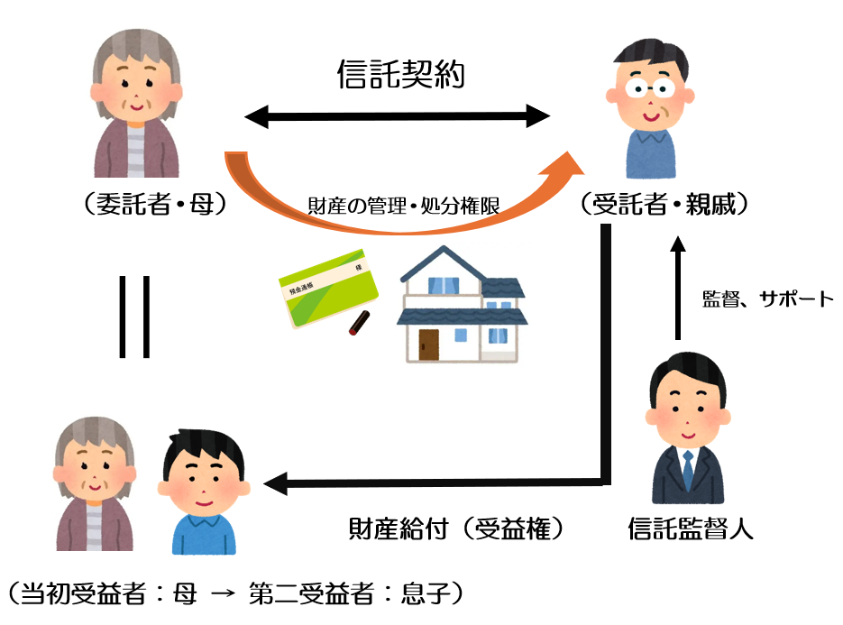 母親が生きている間は、母親が当初受益者として、受託者から信託財産の給付を受けるようにし、母親の死後、今度は息子が第二受益者として、受託者から財産の給付を受けるようにします。